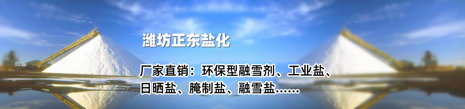濰坊正東鹽化有限公司,地處中國的海洋化工產業基地——山東濰坊濱海經濟開發區,東臨濰坊港、南臨榮烏高速和濟青高速、地理位置優越、交通通訊發達、原材料供應充足,配套設施完備。 我公司是以生產工業鹽,環保型融雪鹽、凍結型融雪鹽等產品。    我公司擁有三大制鹽場區,經營多種海鹽產品,自產自銷,共占地48000公畝,年產各種規格型號的鹽系列產品12萬噸。公司以“誠信、務實、專業、互利“為服務理念,以“客戶至上,合作共贏”為服務宗旨,“價格低、周期短、質量高、服務優”是正東鹽化對客戶的承諾!望有識之士聯系,共同進步,同創輝煌。為客戶降低成本,本公司與省內外多家用鹽企業有良好的合作。
